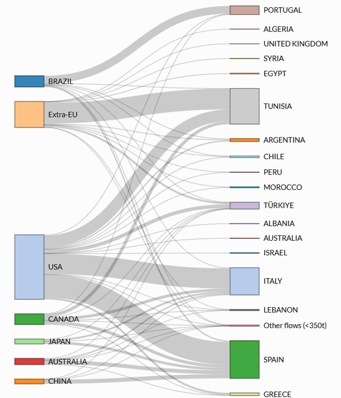 Οι κύριες χώρες-εταίροι που προμήθευσαν αυτές τις αγορές ήταν η Ισπανία, η Τυνησία και η Ιταλία με ποσοστά 29,4%, 27,9% και 21,2%, ενώ το μερίδιο αγοράς της Ελλάδας ανέρχεται στο 2,2% έχοντας όμως εντυπωσιακή άνοδο 43,7% σε σχέση με την αντίστοιχη περίοδο της προηγούμενης ελαιοκομικής περιόδου, που είναι και η μεγαλύτερη σε σχέση με όλες τις χώρες που εξετάζονται.