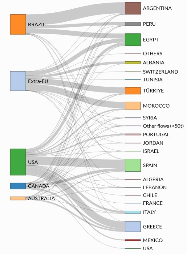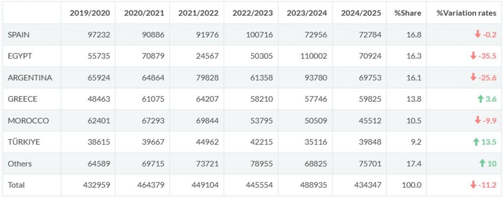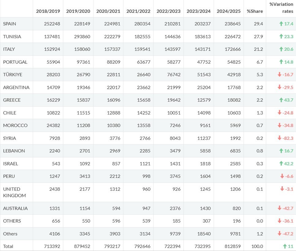 Οι εισαγωγές από ορισμένες από τις κύριες αγορές (Αυστραλία, Βραζιλία, Καναδάς, ΗΠΑ, Κίνα) μεταξύ Οκτωβρίου 2024 και Αυγούστου 2025 αυξήθηκαν κατά 11% σε σύγκριση με την ίδια περίοδο του 2023/2024. Παρατηρήθηκε ανάκαμψη στους όγκους εισαγωγών στην Αυστραλία, τον Καναδά, την Κίνα και τις Ηνωμένες Πολιτείες.