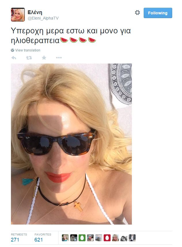 Μπορεί βέβαια να μην βούτηξε, ωστόσο έκανε ηλιοθεραπεία και ανέβαζε την παρακάτω φωτογραφία στο twitter γράφοντας στη λεζάντα: «Υπέροχη μέρα έστω και μόνο για ηλιοθεραπεία».