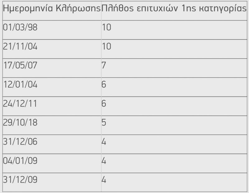 Δείτε παρακάτω τις κληρώσεις με τους περισσότερους μεγάλους νικητές στην ιστορία του παιχνιδιού:
