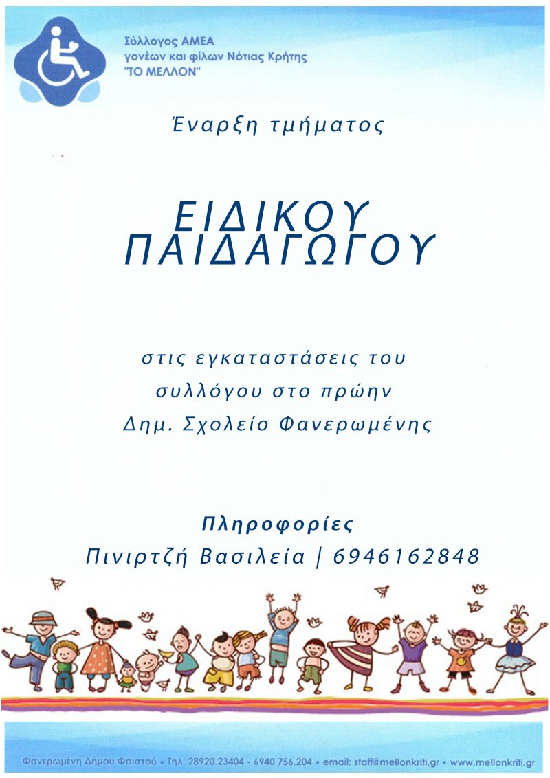 Ο σύλλογος ΑμεΑ «ΤΟ ΜΕΛΛΟΝ» ανακοινώνει την έναρξη τμήματος ειδικής παιδαγωγού στις εγκαταστάσεις του συλλόγου.