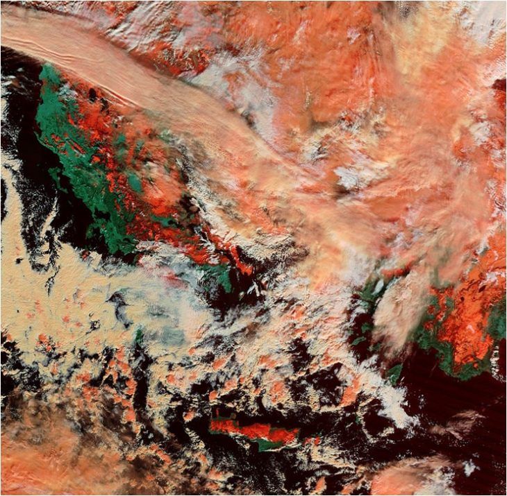 Οι εικόνες αυτές έχουν υποστεί ειδική επεξεργασία και αποτυπώνουν με τον καλύτερο τρόπο τις χιονοστρώσεις στην επιφάνεια του εδάφους με κόκκινο χρώμα, τις ακάλυπτες επιφάνειες εδάφους με πράσινο χρώμα, τη θάλασσα σε μαύρο και τα νέφη λευκά (οι πορτοκαλί αποχρώσεις εντός των νεφών απεικονίζουν την περιεκτικότητα τους σε παγωμένης μορφής κρυστάλλους).