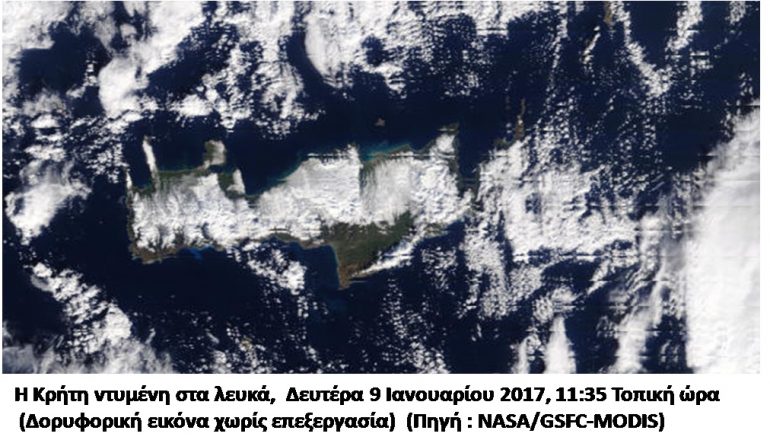 Αποκαλυπτικές δορυφορικές φωτογραφίες της Ελλάδας, με ιδιαίτερη εστίαση στην Κρήτη, οι οποίες ελήφθησαν την επόμενη ημέρα (Δευτέρα 9 Ιανουαρίου 2017, 11:35 Τοπική ώρα) της σφοδρής κακοκαιρίας που έπληξε τη χώρα μας (Πηγή : NASA/GFSC – MODIS).
