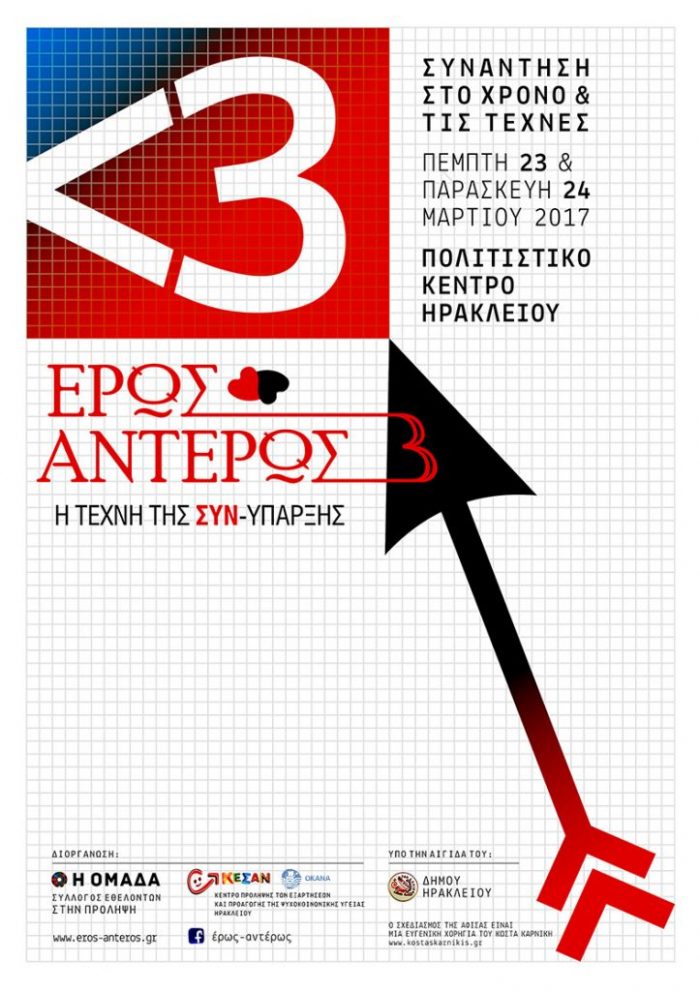Ο Σύλλογος Εθελοντών στην Πρόληψη «Η Ομάδα» και το ΚΕΣΑΝ – Κέντρο Πρόληψης των Εξαρτήσεων και Προαγωγής της Ψυχοκοινωνικής Υγείας Ηρακλείου σας προσκαλούν στη διημερίδα: «Έρως – Αντέρως: Η Τέχνη της συν – Ύπαρξης», 2017, που θα πραγματοποιηθεί την Πέμπτη 23 και την Παρασκευή 24 Μαρτίου 2017, στο Πολιτιστικό Συνεδριακό Κέντρο Ηρακλείου.