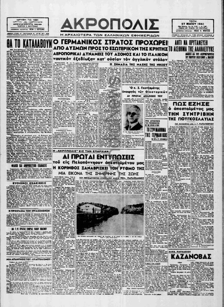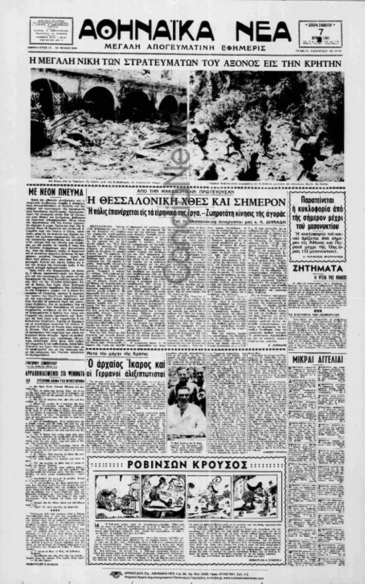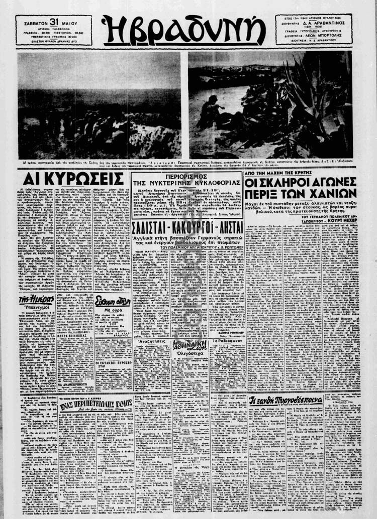 Σήμερα παρουσιάζουμε μερικές από τις εφημερίδες των ημερών που κυκλοφορούσαν στην Ελλάδα (δεν μπορούμε προφανώς να τις προσδιορίσουμε ως «ελληνικές») αλλά και στο εξωτερικό, περιγράφοντας τα γεγονότα της Κρήτης. Η Μάχη στο νησί ήταν το κεντρικό θέμα επί μέρες για τις περισσότερες. Οι εφημερίδες αυτές έχουν φυσικά μεγάλη ιστορική αξία.