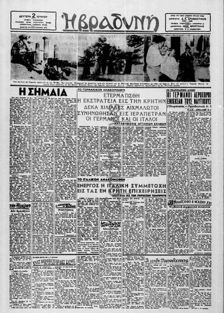 Στο ανάλογο ύφος ήταν τα κατευθυνόμενα «ρεπορτάζ» των εφημερίδων που κυκλοφορούσαν τις ημέρες εκείνες. Όλες οι εφημερίδες ήταν στο πλευρό των Γερμανών, σα να ήταν μια δική τους υπόθεση η κατάκτηση της Κρήτης! Χαρακτηριστικά τα «Αθηναϊκά Νέα» έγραφαν στις 7 Ιουνίου 1941, μετά δηλαδή την πτώση της Κρήτης: «Η μεγάλη νίκη των στρατευμάτων του Άξονος εις Κρήτην». Χρησιμοποιούσαν μάλιστα για τα ρεπορτάζ τους Γερμανούς πολεμικούς ανταποκριτές, όπως το έκανε, για παράδειγμα, η «Βραδυνή».