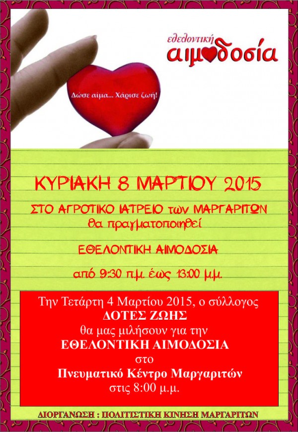 Την Τετάρτη 4 Μαρτίου ο Σύλλογος “Δότες Ζωής” θα μιλήσουν για την Εθελοντική αιμοδοσία στο Πνευματικό Κέντρο Μαργαριτών στις 8:00 μ.μ