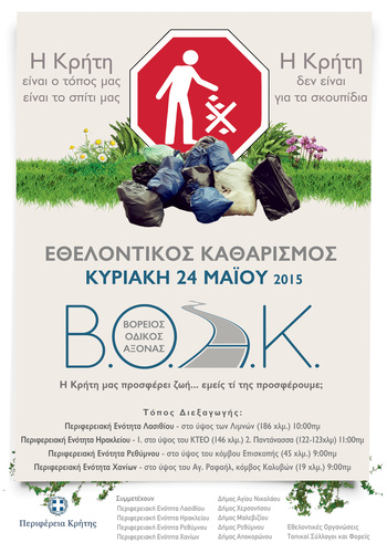 Η Περιφέρεια Κρήτης, την ερχόμενη Κυριακή 24 Μαΐου, σε συνεργασία με την Περιφερειακή Ενότητα Λασιθίου, Ηρακλείου, Ρεθύμνου και Χανίων, το Δήμο Μαλεβιζίου, το Δήμο Χερσονήσου, το Δήμο Αγίου Νικολάου, το Δήμο Ρεθύμνου, το Δήμο Αποκορώνου και το Δήμο Χερσονήσου, καθώς και εθελοντικές οργανώσεις και συλλόγους, διοργανώνει την εθελοντική δράση για τον καθαρισμό του Βόρειου Οδικού Άξονα Κρήτης, μια δράση που στοχεύει στην προστασία του περιβάλλοντος, ένα μείζον θέμα που επηρεάζει τη ζωή μας, τόσο ατομικά όσο και συλλογικά.