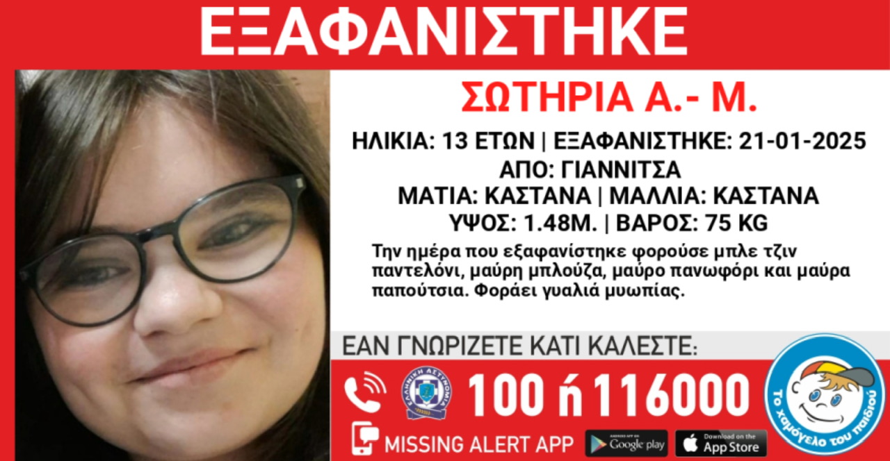 Στις 21 Ιανουαρίου εξαφανίστηκε από ξενώνα εφήβων από την περιοχή των Γιαννιτσών, η Σωτηρία Α. – Μ., 13 ετών.