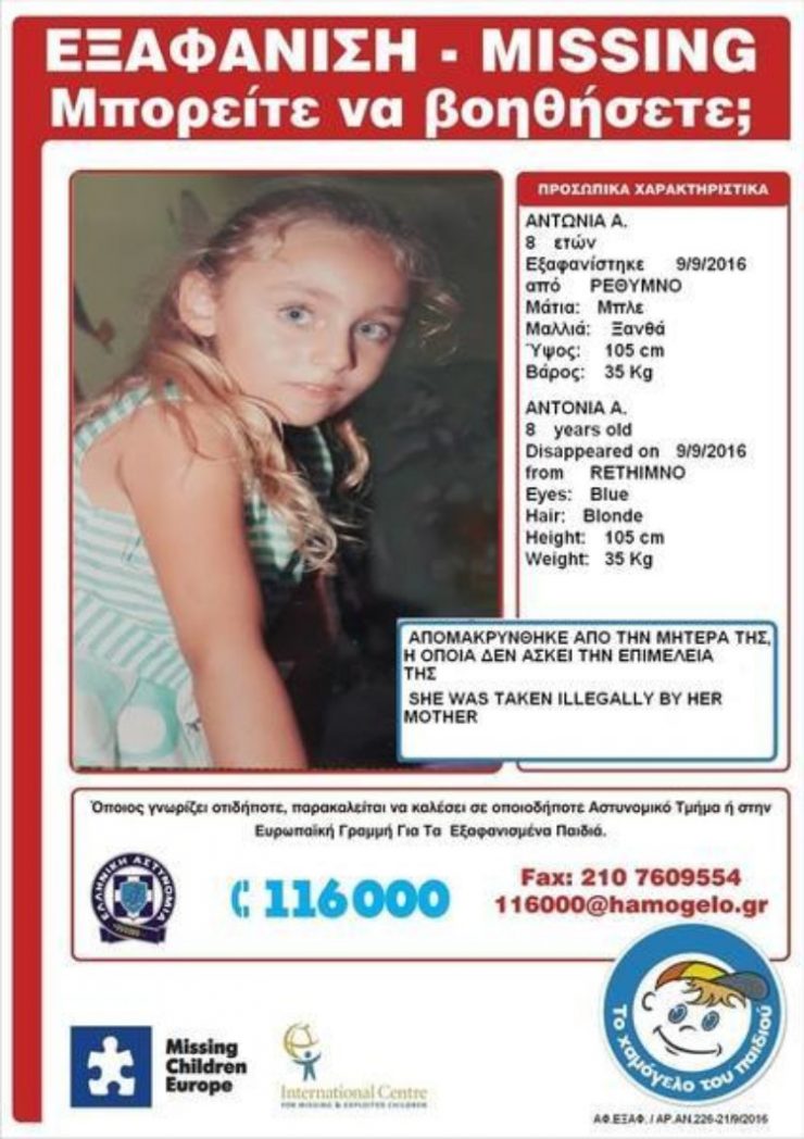 Η Αντωνία Α., έχει ύψος 1,05 μ., ζυγίζει 35 κιλά, έχει ξανθά μαλλιά και μπλε μάτια. Ιδιαίτεροι λόγοι καθιστούν απαραίτητη την άμεση εύρεση της, καθώς η παραμονή της μακριά από το άτομο που ασκεί την επιμέλειά της θέτει σε κίνδυνο την ανήλικη.