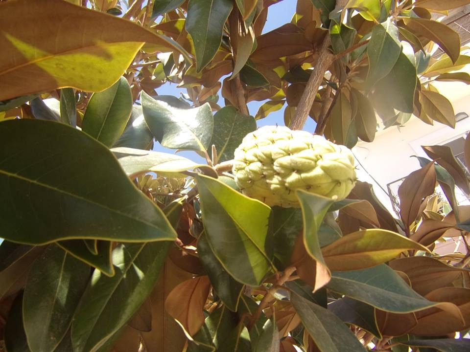 Μας είπε πως η ονομασία του δένδρου είναι “Μανώλια”, και πως μπορεί να μοιάζουν με φρούτα οι εντυπωσιακοί του “καρποί” που είναι και μεγάλοι, αλλά δεν είναι τίποτα το ιδιαίτερο! Μάλλον πρόκειται για το άνθος του δένδρου από ότι κατάλαβα, είναι μόνο για εντυπωσιασμό!