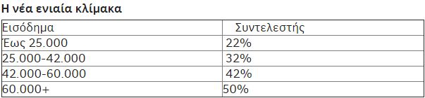 -η υφιστάμενη κλίμακα φορολόγησης του εισοδήματος από μισθούς γίνεται ενιαία για όλους τους φορολογούμενους ενώ προστίθεται σε αυτήν ένας νέος φορολογικός συντελεστή 50% ο οποίος θα εφαρμόζεται στο τμήμα του εισοδήματος πάνω από 60.000 ευρώ. Έτσι η προτεινόμενη νέα κλίμακα φορολόγησης του εισοδήματος φυσικών προσώπων διαμορφώνεται ως εξής: