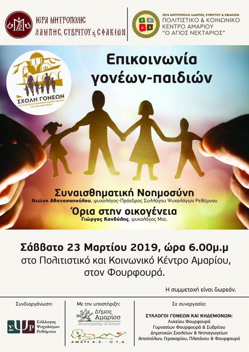Η Σχολή Γονέων του Πολιτιστικού & Κοινωνικού Κέντρου Αμαρίου «Ο Άγιος Νεκτάριος», της Ι. Μητρόπολης Λάμπης, Συβρίτου και Σφακίων, σε συνεργασία με τον Σύλλογο Ψυχολόγων Ρεθύμνου, διοργανώνει την 3η συνάντηση Γονέων με θέμα: “Επικοινωνία γονέων-παιδιών”. Η κ. Θεώνη Αθανασοπούλου, Ψυχολόγος, Πρόεδρος του Συλλόγου Ψυχολόγων Ρεθύμνου, θα αναπτύξει τη θεματική ενότητα «Συναισθηματική Νοημοσύνη» ενώ ο κ. Γιώργος Κανδύλης, Ψυχολόγος Msc, την ενότητα: «Όρια στην Οικογένεια».
