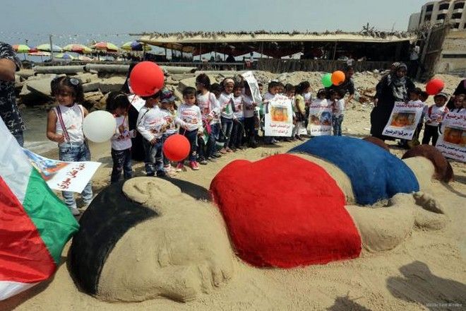 Κάτοικοι της Γάζας φιλοτέχνησαν σήμερα σε μια παραλία ένα τεράστιο γλυπτό από άμμο που απεικονίζει το Αϊλάν Κούρντι προκειμένου να αποτίσουν φόρο τιμής στο παιδί από τη Συρία που πνίγηκε καθώς επιχειρούσε να φθάσει στην Ευρώπη και η φωτογραφία του οποίου προκάλεσε ρίγη συγκίνησης σε ολόκληρο τον κόσμο.