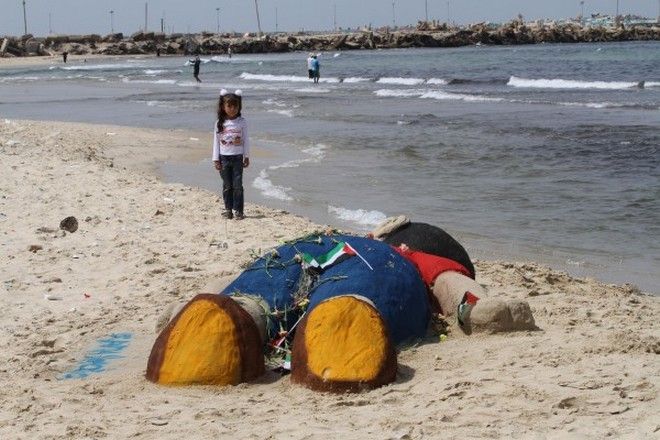 Ένα τεράστιο άγαλμα του μικρού Αϊλάν Κουρντί, η σορός του οποίου ξεβράστηκε σε παραλία του Μπόντρουμ όταν η βάρκα που μετέφερε τον ίδιο και την οικογένειά του στη Κω βούλιαξε στο Αιγαίο, δεσπόζει σε παραλία της Γάζας (Vid +Pics)