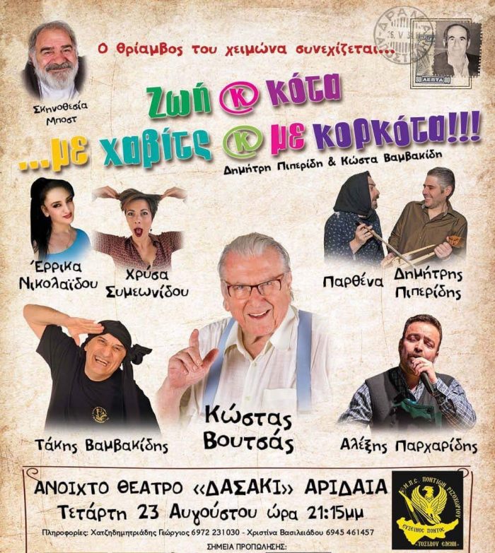 Η ποντιακή επιθεώρηση Ζωή και κότα… με χαβίτς και με κορκότα, σε σκηνοθεσία Γιάννη Μποσταντζόγλου, παρουσιάστηκε χθες Τετάρτη 23 Αυγούστου στις 21:15, στο ανοιχτό θέατρο «Δασάκι» Αριδαίας.