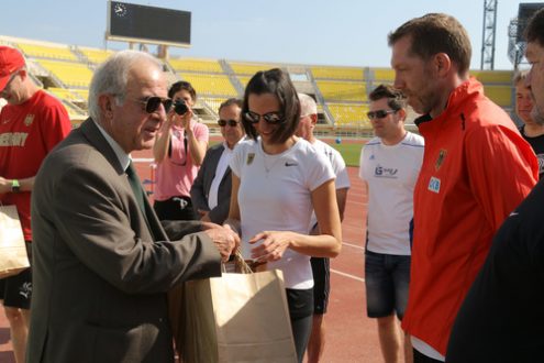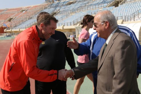 Τους Γερμανούς αθλητές και προπονητές στίβου που έχουν επιλέξει το Παγκρήτιο Στάδιο για την προετοιμασία τους συνάντησε το πρωί της Τετάρτης 5 Απριλίου ο Δήμαρχος Ηρακλείου Βασίλης Λαμπρινός