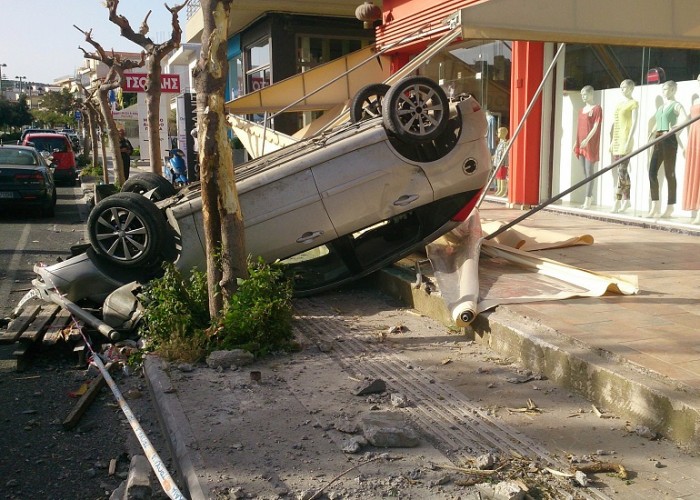 Σύμφωνα με το cretapost.gr,στις 5:30 τα ξημερώματα το αυτοκίνητο που οδηγούσε ο συγκεκριμένος οδηγός βγήκε από το δρόμο του και ακολούθησε μια τρελή… πορεία παρασύροντας στο πέρασμά του ένα δέντρο που το ξερίζωσε, ένα τσιμεντένιο παγκάκι και σταμάτησε μπροστά στη βιτρίνα ενός καταστήματος.
