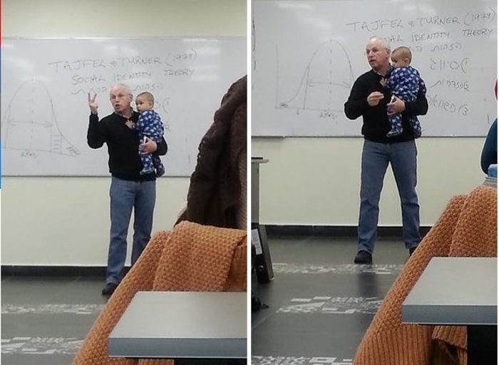 Οταν το μωρό άρχισε να κλαίει, η μαμά του σηκώθηκε για να βγει μαζί του έξω. Εκείνη την ώρα, ο καθηγητής πήρε το μωρό στην αγκαλιά του και συνέχισε το μάθημα σα να μη συμβαίνει τίποτα.