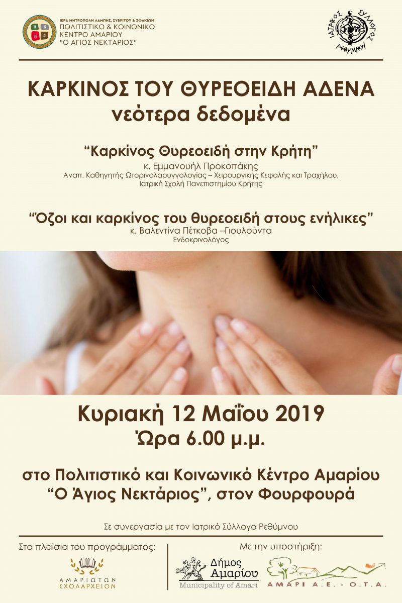 Το Πολιτιστικό & Κοινωνικό Κέντρο Αμαρίου “Ο Άγιος Νεκτάριος” της Ιεράς Μητροπόλεως Λάμπης, Συβρίτου και Σφακίων, στα πλαίσια του Προγράμματος «ΑΜΑΡΙΩΤΩΝ ΣΧΟΛΑΡΧΕΙΟΝ» και σε συνεργασία με τον Ιατρικό Σύλλογο Ρεθύμνου διοργανώνουν ημερίδα με θέμα: «ΚΑΡΚΙΝΟΣ ΤΟΥ ΘΥΡΕΟΕΙΔΗ ΑΔΕΝΑ – ΝΕΟΤΕΡΑ ΔΕΔΟΜΕΝΑ».