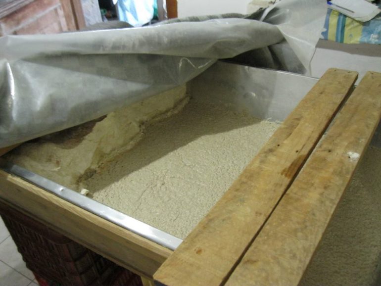 Δεν είχαμε σήμερα κουνενό, και έτσι στα 35 κιλά αλεύρι βάλαμε 150 γραμμάρια μαγιά, ένα κιλό ζάχαρη, και 400 γραμμάρια αλάτι.