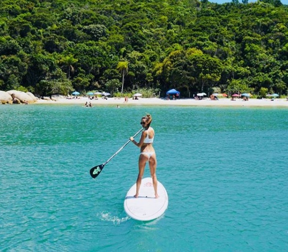 Επιδεικνύει τα καλοσχηματισμένα της οπίσθια κάνοντας paddleboarding