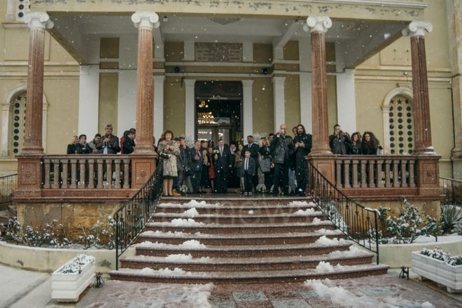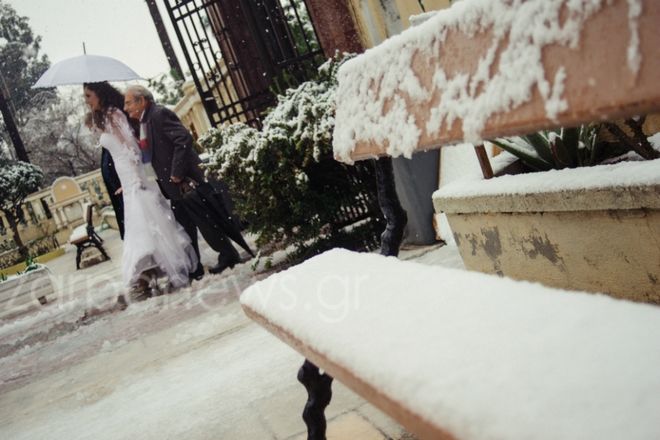 Μέσα σ’ αυτό το σπάνιο και παραμυθένιο σκηνικό, η Γεωργία, με ένα δαντελένιο νυφικό και κρατώντας ολόλευκη ομπρέλα, όχι μόνο δεν πτοήθηκε από τον χιονιά αλλά περήφανη και… ατρόμητη, ανέβηκε τα σκαλιά και κατευθύνθηκε στον Ναό, όπου την περίμενε ο αγαπημένος της, Ανδρέας.