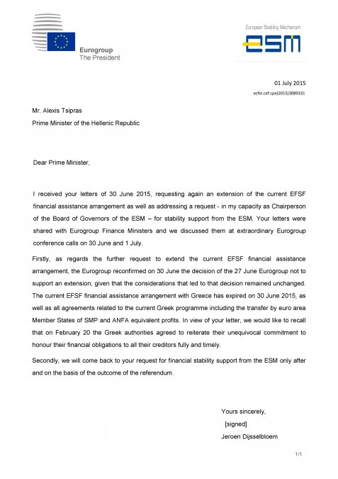 «Έλαβα τις επιστολές σας από τις 30 Ιουνίου 2015, που αιτούνταν ξανά την επέκταση της τρέχουσας συμφωνίας χρηματοδοτικής βοήθειας του EFSF όπως και ένα αίτημα για τη στήριξη από τον ESM. Οι επιστολές σας διανεμήθηκαν στους υπουργούς Οικονομικών του Eurogroup και τις συζητήσαμε στις έκτακτες συσκέψεις που έγιναν στις 30 Ιουνίου και 1 Ιουλίου.