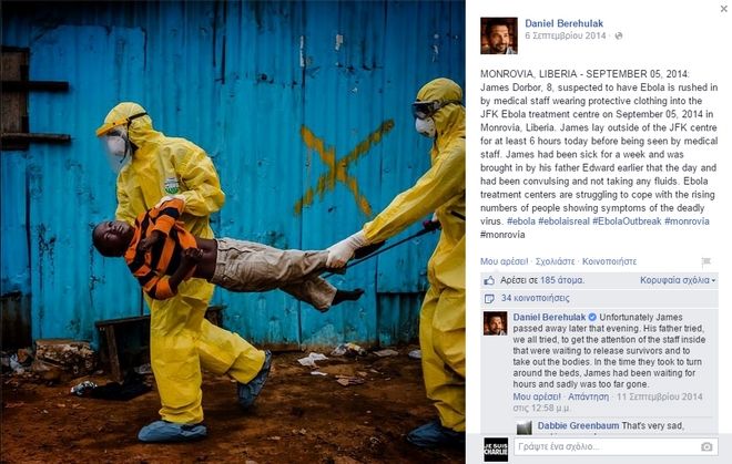 «Στις 5 Σεπτεμβρίου, την ημέρα που τράβηξα την φωτογραφία με τον μικρό Τζέιμς, είχα ήδη συμπληρώσει δύο εβδομάδες στην Λιβερία, ως απεσταλμένος των New York Times για να καλύψω φωτογραφικά την εξάπλωση του ιού Έμπολα. Η ημέρα μου ξεκίνησε ακολουθώντας μία ομάδα νοσηλευτών που συγκέντρωναν ασθενείς σε μία μονάδα νοσηλείας. Κάποια στιγμή το βλέμμα μου έπεσε πάνω στον 8χρονο Τζέιμς Ντόρμπορ ο οποίος αργοπέθαινε πεσμένος στο χώμα. Φορώντας χειρουργικά γάντια ο πατέρας του παιδιού, Εντουαρντ, τον πήρε αγκαλιά και προσπάθησε να του δώσει να να πιει το νερό μίας καρύδας. Στην συνέχεια πήρε ένα μπουκάλι νερό και έβρεξε τα χείλη του. Το αγόρι δεν δεχόταν να πιεί. Θέλοντας να βοηθήσω άρπαξα μερικά μπουκάλια νερό και τα πέταξα προς τον Έντουαρντ. Ταυτόχρονα υπενθύμιζα στον εαυτό μου ότι όσοι με περιτριγύριζαν ήταν δυνητικοί φορείς του ιού και προσπαθούσα να κρατήσω τις αποστάσεις μου».