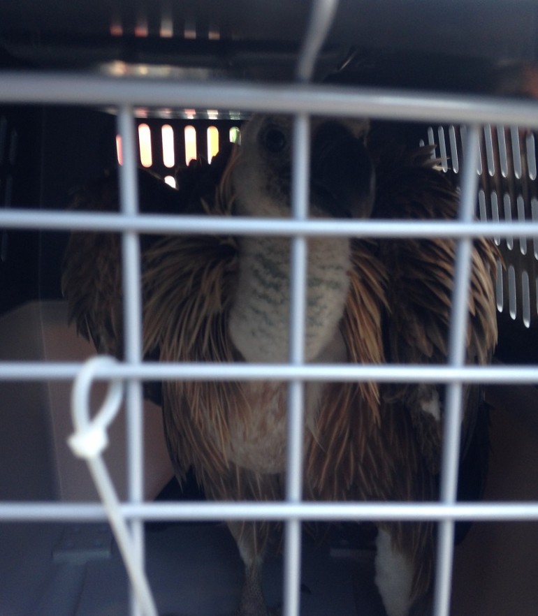 «Το Σάββατο 26/9 ειδοποιηθήκαμε ταυτόχρονα σχεδόν από έναν ιδιώτη, τον κο Μανώλη Μπαντουράκη και την Πυροσβεστική για έναν Γύπα που έπεσε σε μια γειτονιά στo Κορακοβούνι (κυριολεκτικά προσγειώθηκε πάνω στο μηχανάκι που οδηγούσε). Το πουλί έπιασε ένας γείτονας, ο κος Μιχάλης Κυριακίδης και εθελοντές του ΕΚΠΑΖ πήγαν και το παρέλαβαν. Ο Γύπας ήταν υποσιτισμένος και σε κατάσταση σοκ. Πήρε τις Πρώτες Βοήθειες, συνήλθε πολύ γρήγορα και άμεσα μεταφέρθηκε στο ΕΚΠΑΖ στην Αίγινα όπου θα μείνει για να δυναμώσει και θα επιστρέψει το ερχόμενο Καλοκαίρι για να απελευθερωθεί.