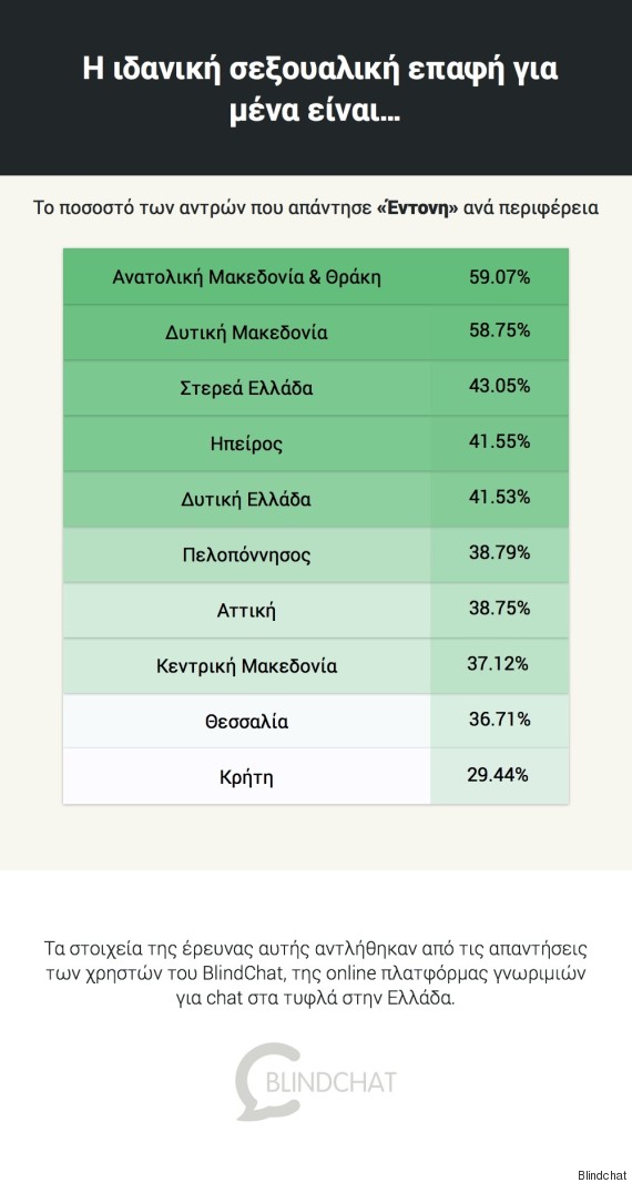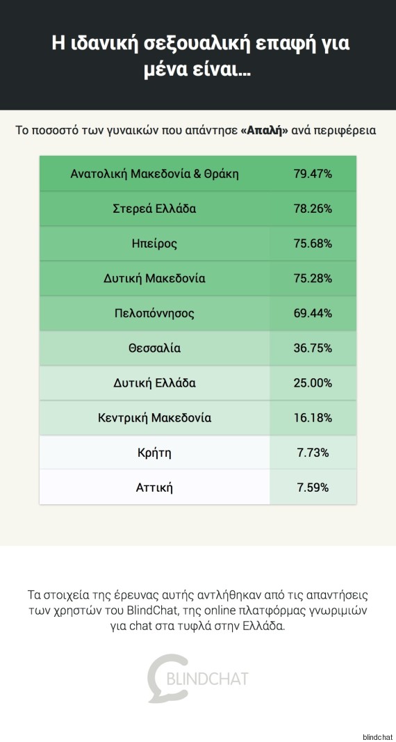– Μόλις 1 στις 13 γυναίκες στην Αττική θέλει απαλή ερωτική επαφή όταν στην Ανατολική Μακεδονία & Θράκη είναι 10 στις 13!