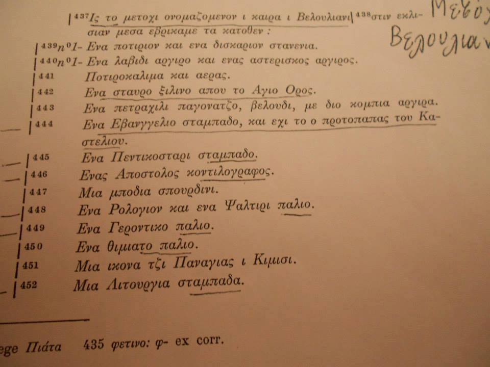 Μετέβη λοιπόν ο ιερομόναχος Ιερεμίας Κορνάρος μαζί με τον νοτάριο Γεώργιο Καλαμαρά στου Βελούλι, όπου συντάχτηκε η απογραφή που σας παραθέτω.