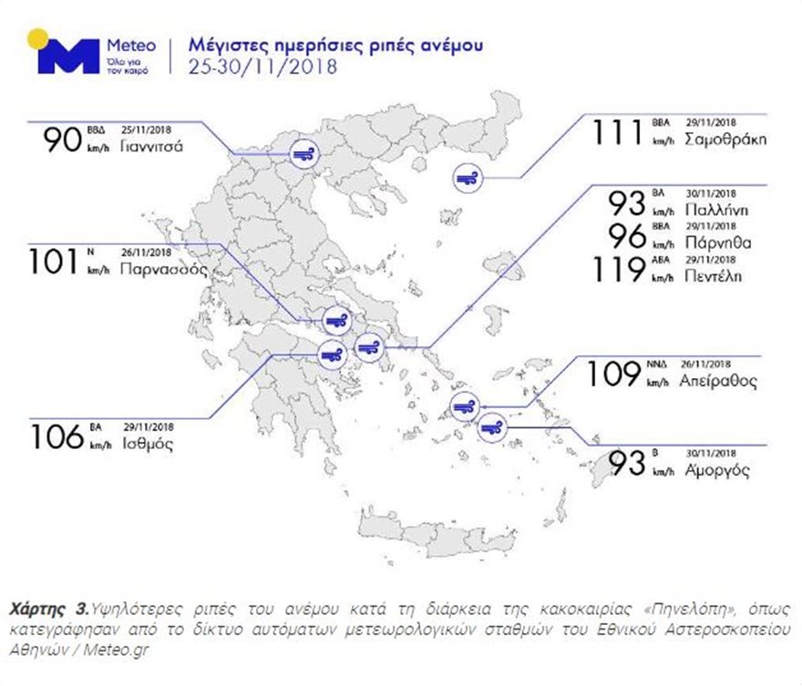 Οι υψηλότερες ριπές του ανέμου εμφανίζονται στο Χάρτη 4, όπως κατεγράφησαν από το δίκτυο αυτόματων μετεωρολογικών σταθμών του Εθνικού Αστεροσκοπείου Αθηνών / Meteo.gr.