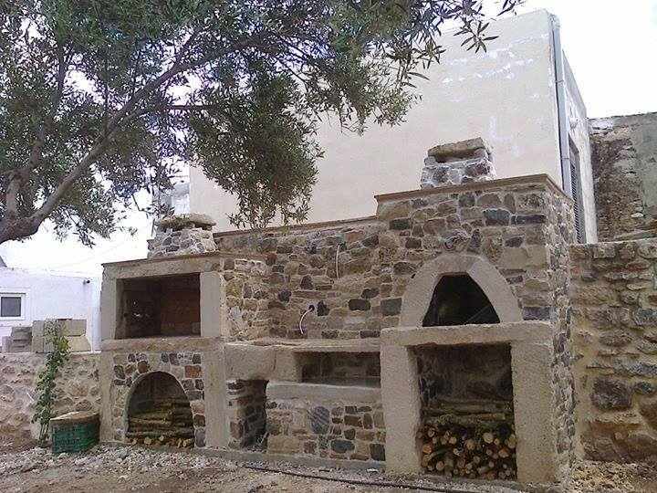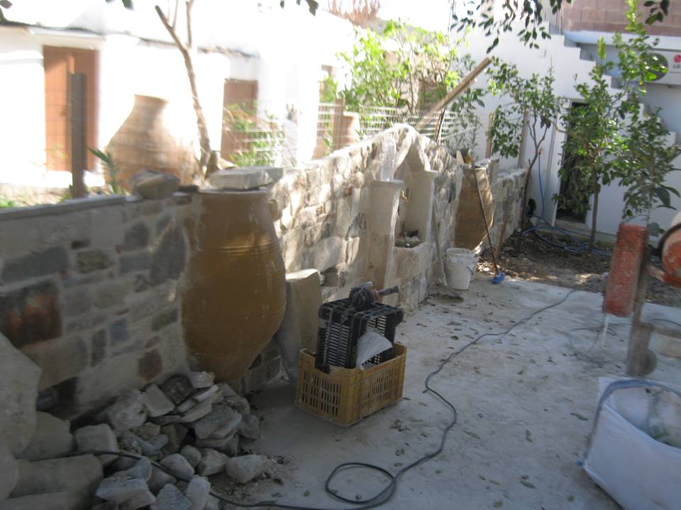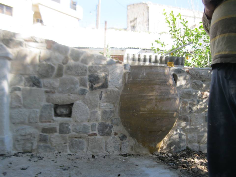 Οι φώτο δείχνουν την επένδυση πέτρας, με εντοιχισμένα πιθάρια, κουρούπες, με γούρνες και στο βάθος το καθιστικό.