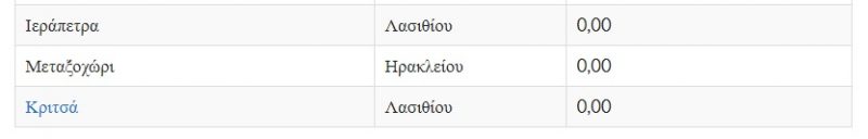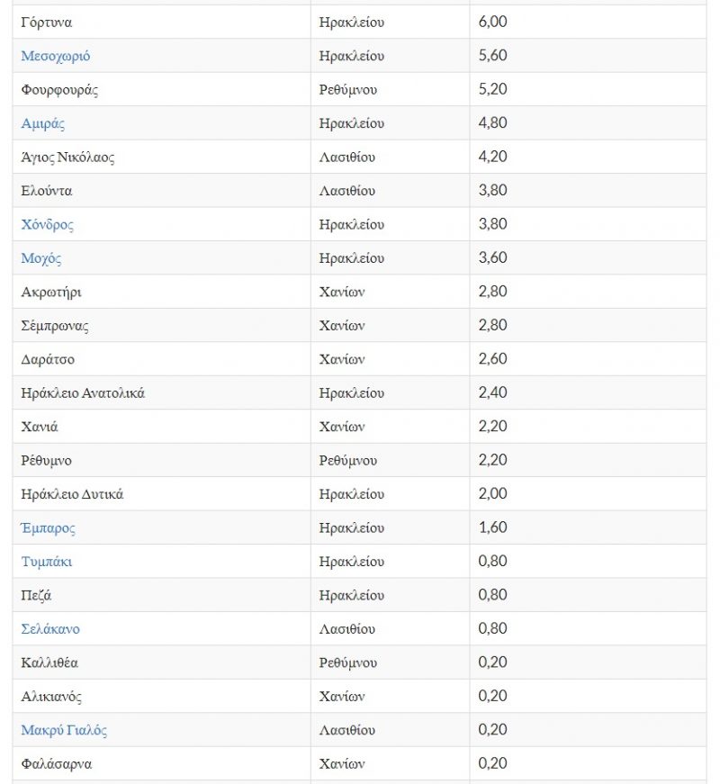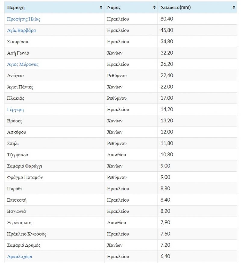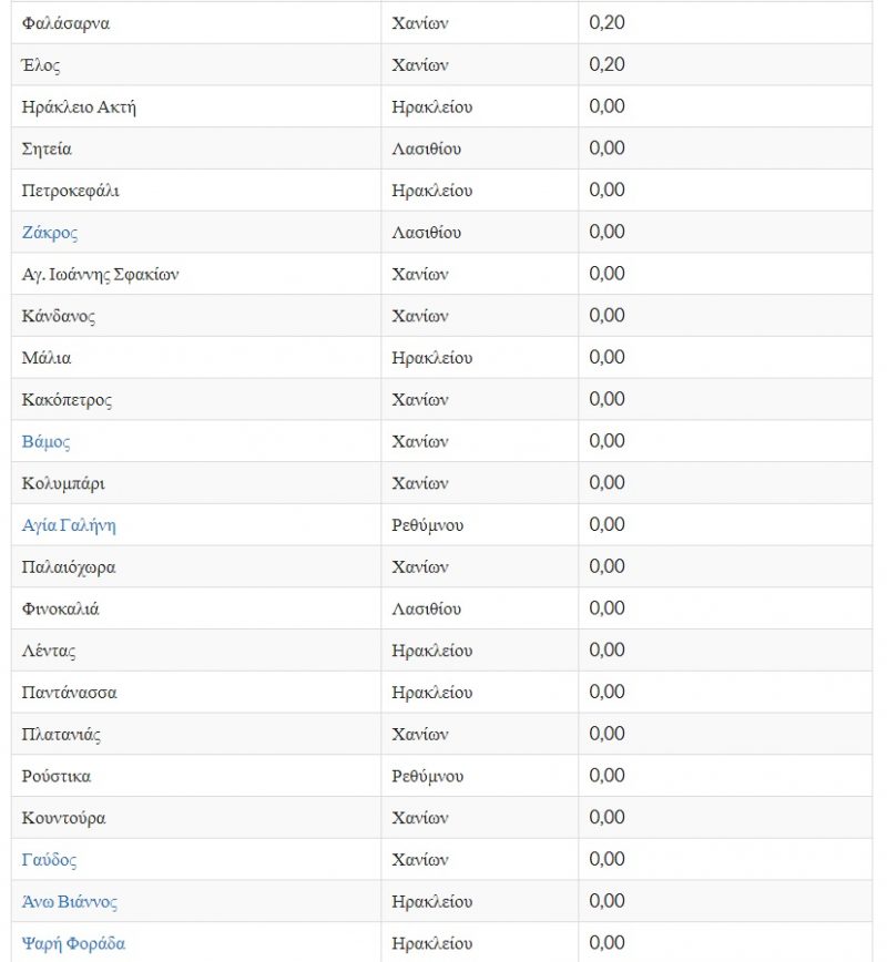 Για το μήνα Ιούλιο αναλυτικά ο πίνακας με τα χιλιοστά βροχής ανά περιοχής της Κρήτης
