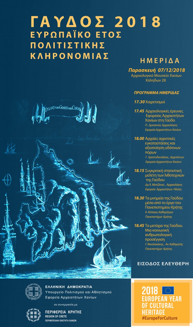 Ημερίδα με τίτλο «Η Γαύδος και τα μνημεία της» και αντικείμενο τους αρχαιολογικούς χώρους της Γαύδου, θα πραγματοποιηθεί στο Αρχαιολογικό Μουσείο Χανίων, την Παρασκευή 07-12 στις 17.30.