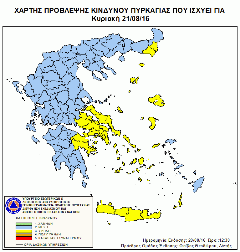 Σύμφωνα με τον Χάρτη Πρόβλεψης Κινδύνου Πυρκαγιάς που εκδίδει η Γενική Γραμματεία Πολιτικής Προστασίας του Υπουργείου Εσωτερικών & Διοικητικής Ανασυγκρότησης, για σήμερα Κυριακή 21 Αυγούστου, προβλέπεται υψηλός κίνδυνος πυρκαγιάς (κίτρινο) σε Έβρο και Ροδόπη, τα νησιά του Αιγαίου και την Κρήτη, την Εύβοια και τη δυτική Στερεά Ελλάδα, το δυτικό άκρο της Πελοποννήσου και τα νησιά του Ιονίου.