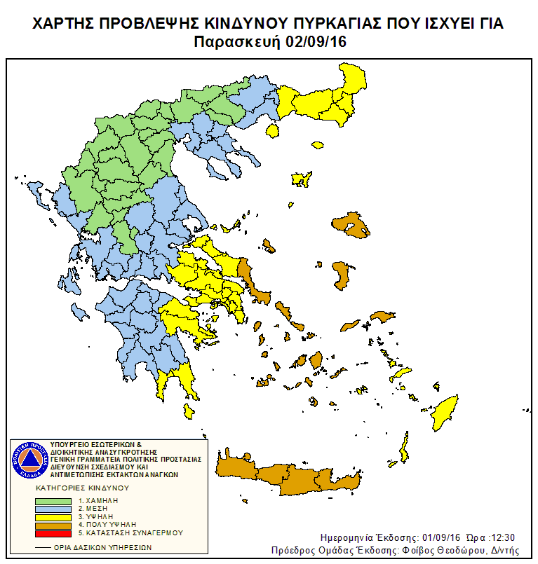 Σύμφωνα με το χάρτη πρόβλεψης κινδύνου πυρκαγιάς που εξέδωσε η Γενική Γραμματεία Πολιτικής Προστασίας για την Παρασκευή 2 Σεπτεμβρίου 2016 προβλέπεται πολύ υψηλός κίνδυνος πυρκαγιάς (κατηγορία κινδύνου 4) σε ολόκληρη την Κρήτη