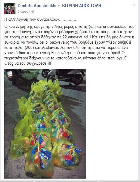 “Ο κυρ Δημήτρης έφυγε πριν λίγες μέρες απο τη ζωή και οι συνάδελφοι του γιου του Γιάννη, αντί στεφάνου μάζεψαν χρήματα τα οποία μετατράπηκαν σε τρόφιμα τα οποία δόθηκαν σε 22 οικογένειες!!! Και επειδή μας δίνεται η ευκαιρία, να τονίσω ότι οι οικογένειες που βοηθάμε έχουν πλέον αυξηθεί κατά πολύ, (200) καταλαβαίνετε λοιπόν όλοι ότι πρέπει να περάσει ένα χρονικό διάστημα για να έρθει ξανά η σειρά κάποιου για να πάρει!! Οι περισσότεροι δείχνουν να το καταλαβαίνουν, κάποιοι άλλοι παλι όχι..Ο Θεός να τον συγχωρέσει!!!”