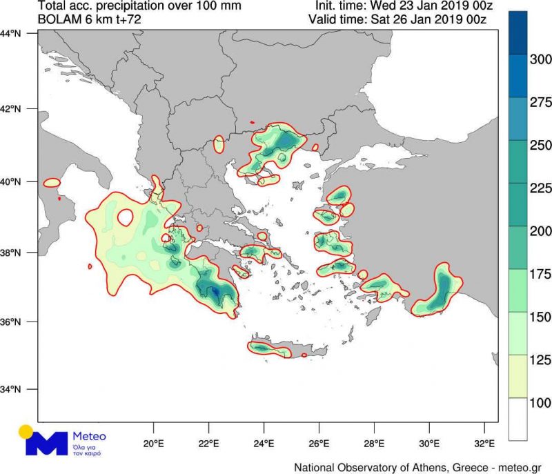 Στο βίντεο που ακολουθεί φαίνεται ο αναμενόμενος υετός (βροχή, χιόνι, χαλάζι) από την Τετάρτη 23/01 έως την Παρασκευή 25/01, ενώ στο Χάρτη 1 παρουσιάζονται οι περιοχές όπου ο ολικός υετός αναμένεται να ξεπεράσει τα 100 χιλιοστά έως το βράδυ της Παρασκευής 25/01.