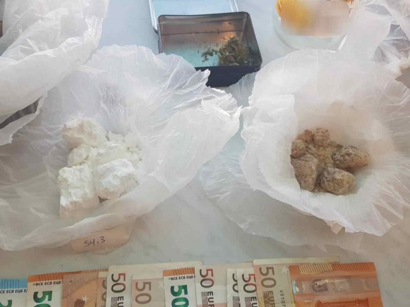 Βρέθηκαν και κατασχεθήκαν σχεδόν 80 γραμμάρια κοκαΐνης, περισσότερα από 70 γραμμάρια κρυσταλλικής μεθαμφεταμίνης, 350 γραμμάρια κάνναβης, ζυγαριά ακριβείας και χρηματικό ποσό