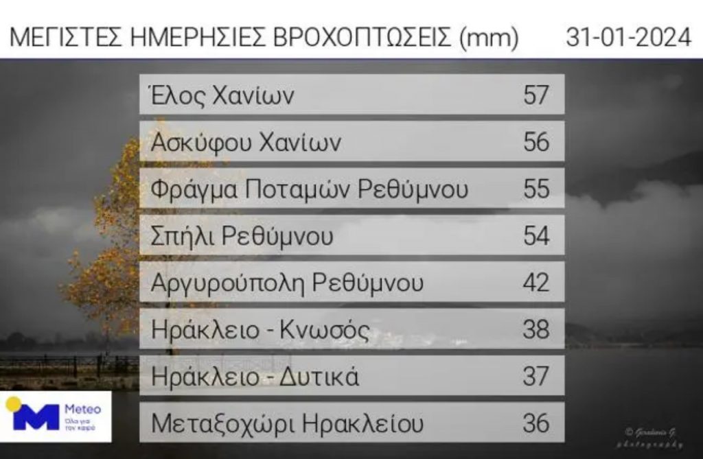 Σύμφωνα με το δίκτυο αυτόματων μετεωρολογικών σταθμών του meteo.gr / Εθνικού Αστεροσκοπείου Αθηνών το μεγαλύτερο ύψος βροχής έως το πρωί της Τετάρτης καταγράφηκε στο Ελος με 57 χιλιοστά και στα Ασκύφου Χανίων κι έφτασε τα 56 χιλιοστά.