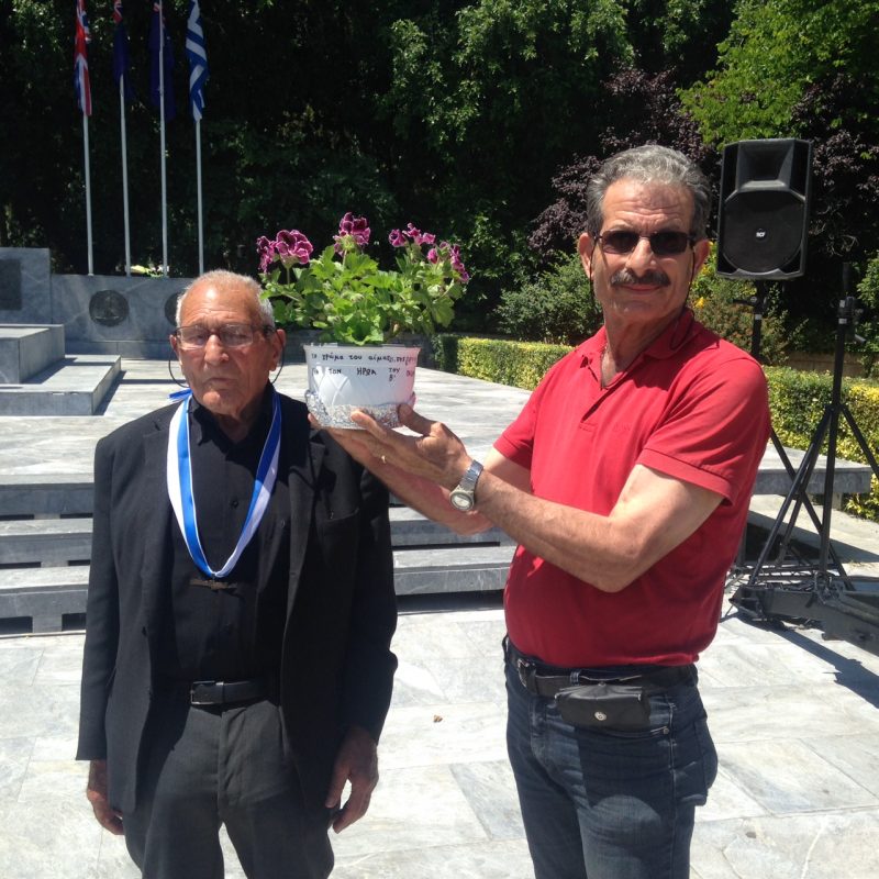 Αίσθηση και συγκίνηση προκάλεσε στους παραβρισκόμενους η κατάθεση στεφάνων από τους εκπροσώπους της Ένωσης Αναπήρων και Θυμάτων πολέμου ν. Ηρακλείου, τον αιωνόβιο επιζώντα τραυματία αγωνιστή της Μάχης Κρήτης Γεώργιο Παλαιάκη, και τον τελευταίο επιζώντα της Ανεξάρτητης αντάρτικης Ομάδας Ανωγείων «Ο Ψηλορείτης» Χαράλαμπο Μαυρογιάννη.