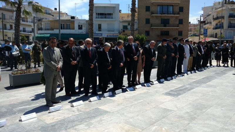 Στη συνέχεια πραγματοποιήθηκε επιμνημόσυνη δέηση από τον Αρχιεπίσκοπο Κρήτης κ.κ. Ειρηναίο και τελετή κατάθεσης στεφάνων στο Μνημείο της «Μάχης Κρήτης» από τους: εκπρόσωπο της Κυβέρνησης Αναπληρωτή Υπουργό Παιδείας, Έρευνας και Θρησκευμάτων Κώστα Φωτάκη, βουλευτές Ηρακλείου Μανόλη Συντιχάκη, Βασίλη Κεγκέρογλου, Σπύρο Δανέλλη, ευρωβουλευτή Νότη Μαριά, Αντιπεριφερειάρχη Κρήτης Νίκο Ξυλούρη, δήμαρχο Ηρακλείου Βασίλη Λαμπρινό, την Υποπρόξενο Μ. Βρετανίας, εκπρόσωποι των Στρατιωτικών, Αστυνομικών αρχών, εκπρόσωποι κομμάτων, φορέων, αποστράτων και αντιστασιακών οργανώσεων.