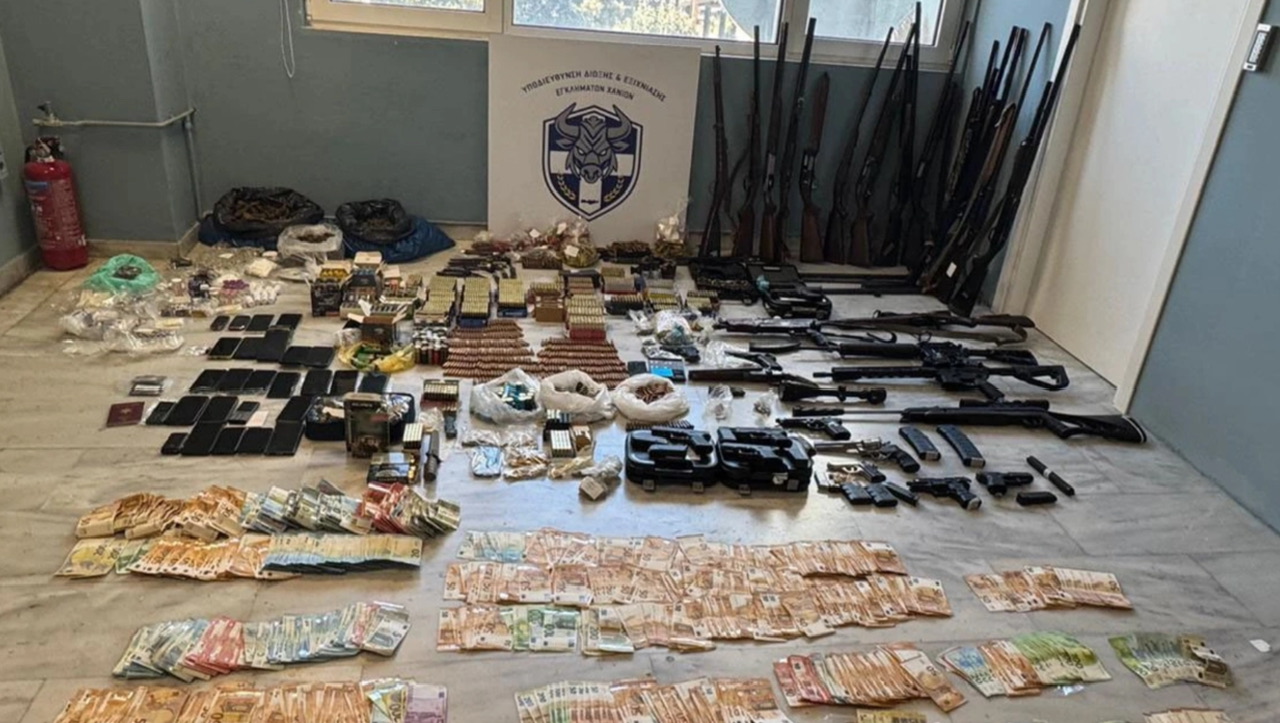 Ένα ολόκληρο δωμάτιο της ΕΛ.ΑΣ καλύπτουν τα κατασχεμένα από την επιχείρηση εξάρθρωσης της μαφίας της Κρήτης, όπως δείχνει η φωτογραφία που έδωσε στη δημοσιότητα η ΕΛ.ΑΣ, μετά την έφοδο που έκανε σε περιοχές των Χανίων.