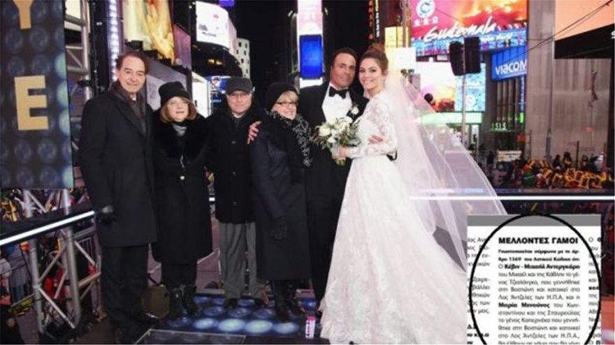Η αναγγελία του γάμου της Μαρίας Μενούνος και του συζύγου της Κέβιν Αντεργκάρο δημοσιεύτηκε σήμερα στην εφημερίδα «Πατρίς» του Ηρακλείου.