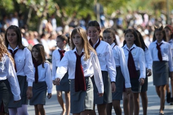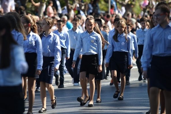 Κάτω από έναν λαμπερό ουρανό, Ηρακλειώτες και επισκέπτες έδωσαν το παρόν και παρακολούθησαν την παρέλαση, χειροκροτώντας.