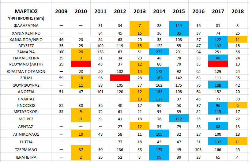 Πίνακας 1: Ύψη βροχής για τον μήνα Μάρτιο από το 2009 ως το 2018. Με κίτρινο χρώμα δίνεται ο ξηρότερος και με μπλε χρώμα ο πιο υγρός Μάρτιος για κάθε σταθμό (τα κόκκινα κελιά σημειώνουν ελλιπείς μετρήσεις και οι παύλες τους σταθμούς οι οποίοι δεν είχαν τεθεί ακόμα σε λειτουργία).