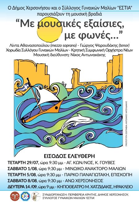 Η Χορωδία Μαλίων και η Κρητική Συμφωνική Ορχήστρα Νέων ενώνουν τις καλλιτεχνικές τους ευαισθησίες, τις μουσικές και τις φωνές τους και μας καλούν σε μια σειρά εκδηλώσεων που θα πραγματοποιηθούν με τη συνδιοργάνωση του Δήμου Χερσονήσου και της Περιφέρειας Κρήτης στον Δήμο Χερσονήσου και στο Ηράκλειο Κρήτης.
