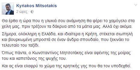 Όπως πάντα, ο Κωνσταντίνος Μητσοτάκης είναι αφέντης της μοίρας του και καπετάνιος της ψυχής του. Και ας είναι ελαφρύ το χώμα της κρητικής γης που θα τον υποδεχθεί».